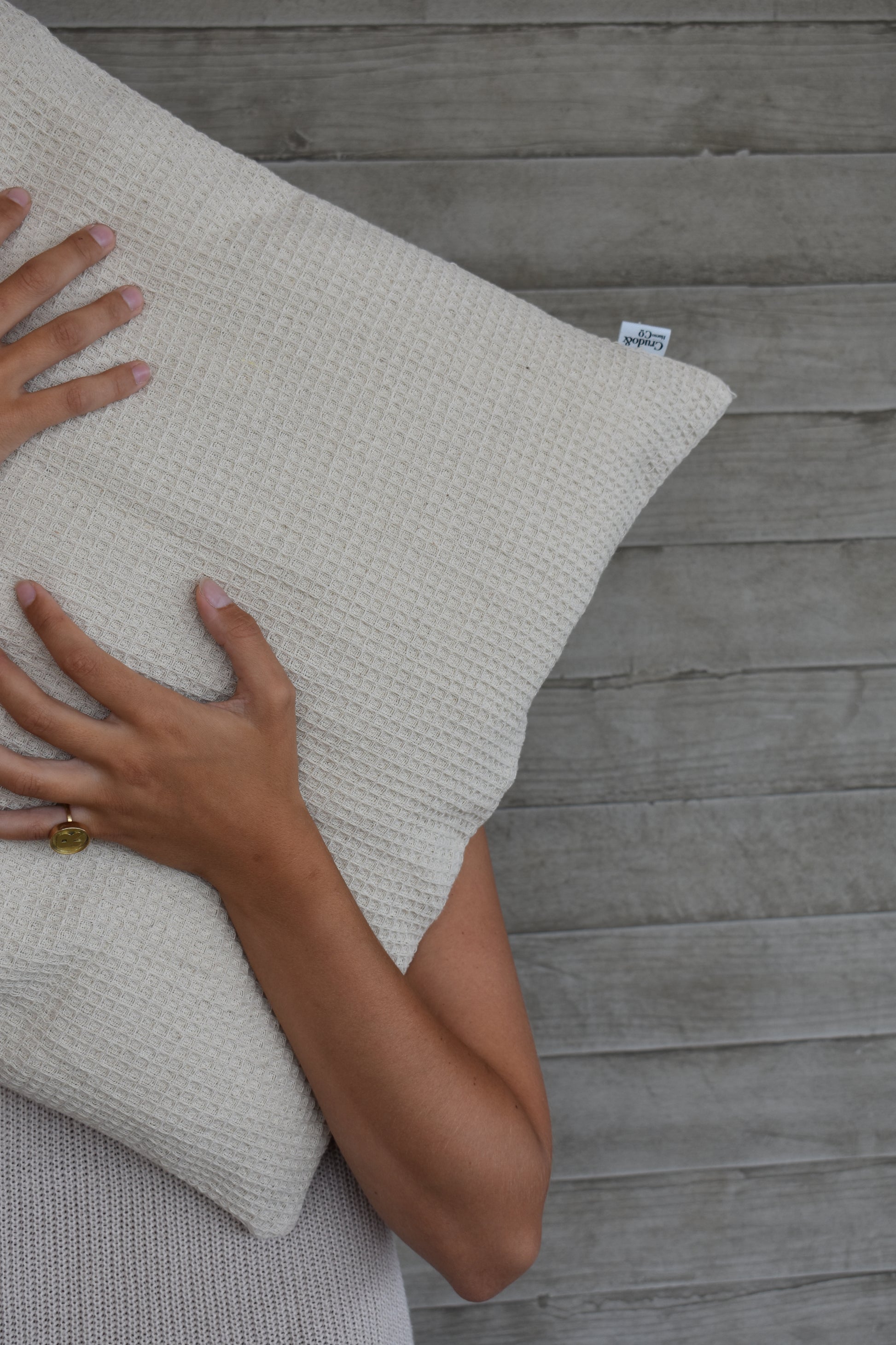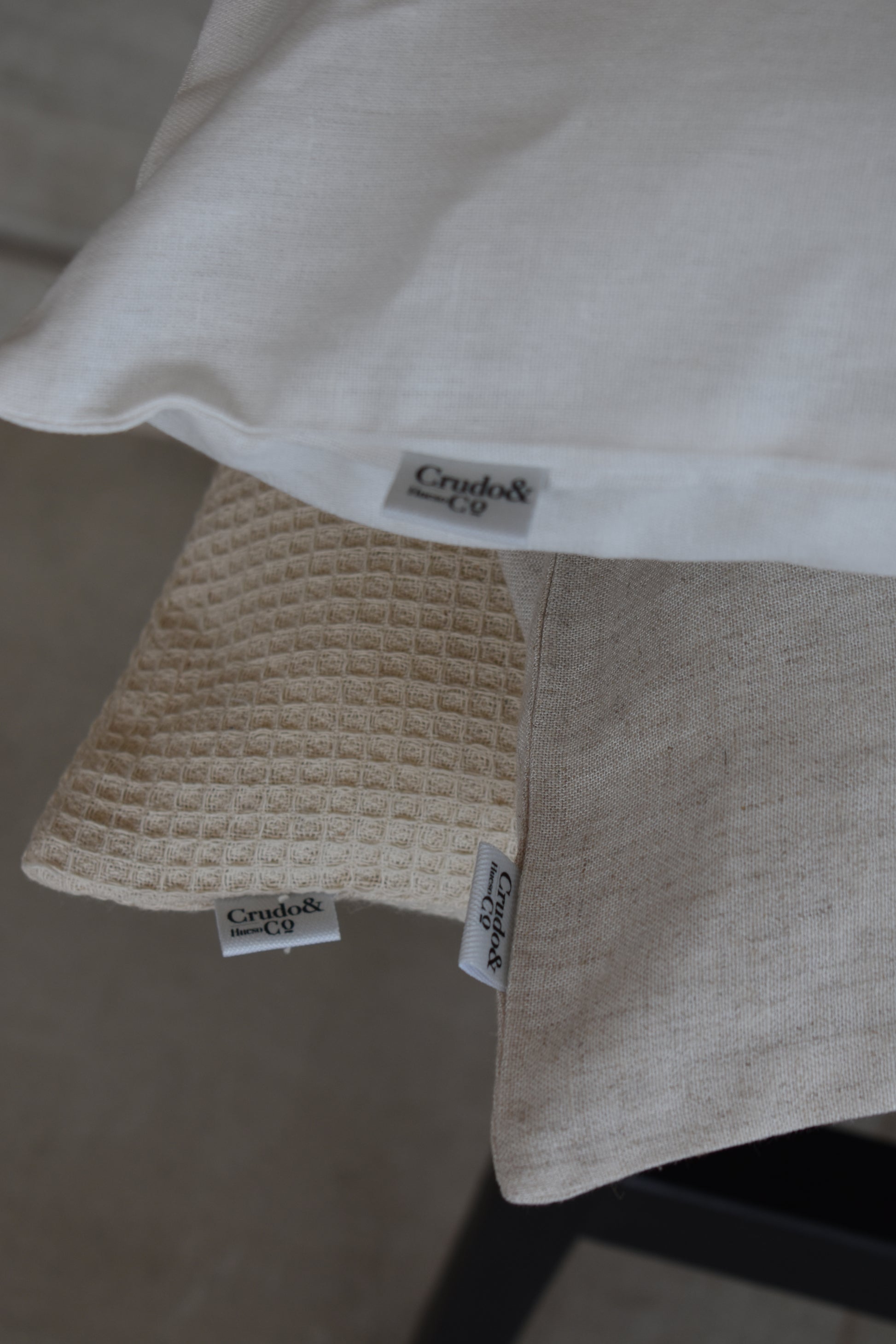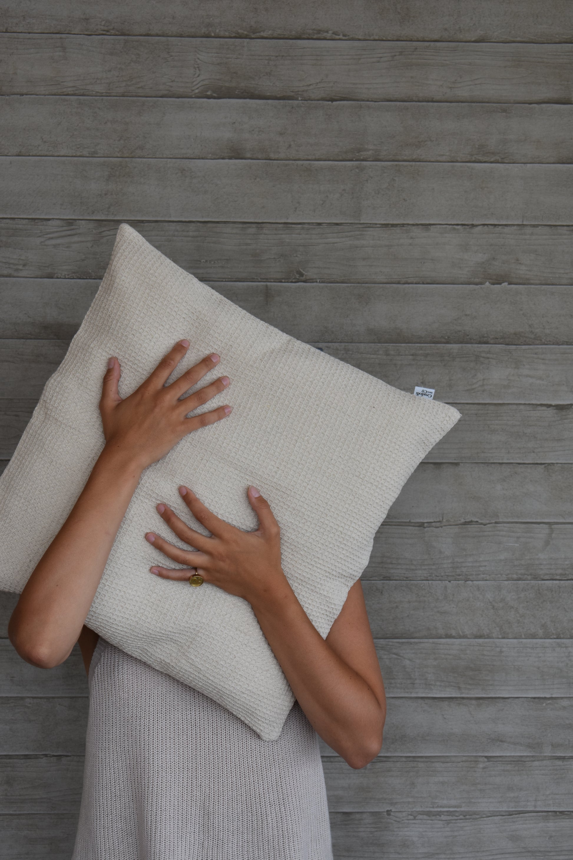 Cojín de tela waffle color crudo. Su medida es de 50x50.
